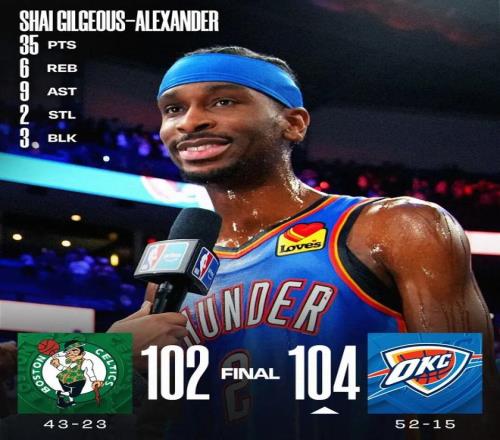 ——剩下1分04秒前,亚历山大急停跳投命中,雷霆100-98凯尔特人